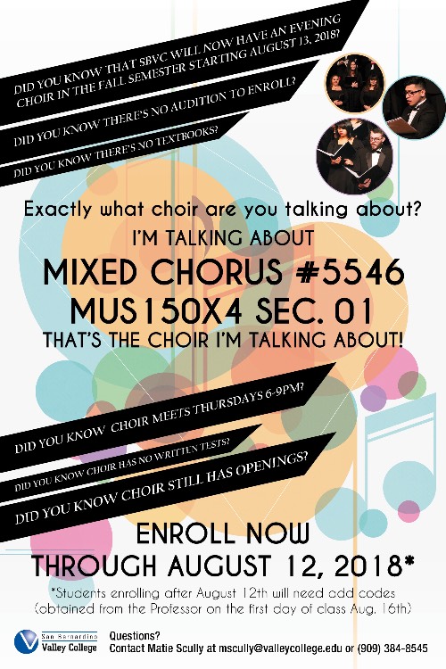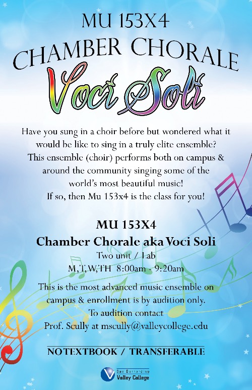 This is a video of the Elementary and Intermediate Voice Classes Recital. The students performing in this video are mostly new voice students and have had only this semester to study Voice. While the video may be entertaining, it is purposed for the students to learn from and to stock of how much progress they have made this semester. To those viewers watching this video, if you too are interested in learning Voice from a very experienced Voice Professor, enroll at San Bernardino Valley College in MUS 130: Elementary Voice Class!